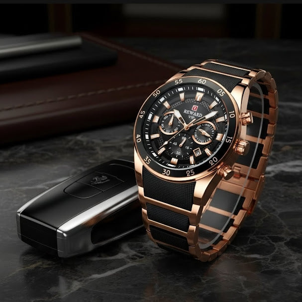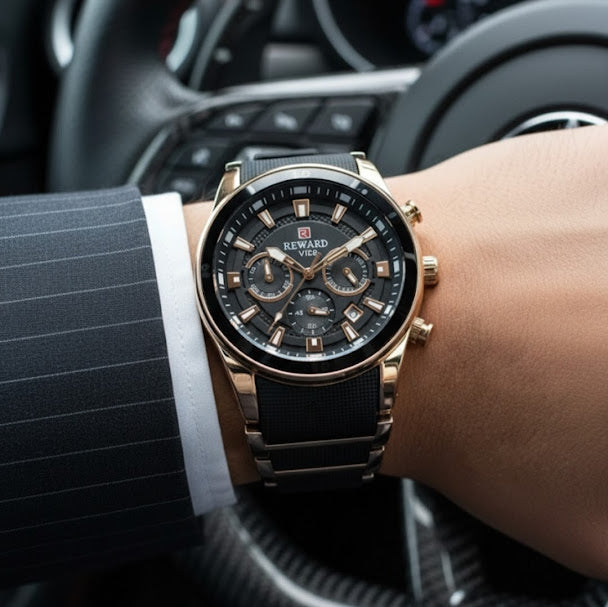 The Executive Chronos is the constant companion of your ambition. Meticulously crafted and rugged enough for the daily grind, its refined aesthetic ensures it's always elegant enough for the win. A timepiece that speaks volumes before you even say a word.